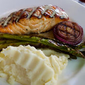 grilled asparagus, red onion, mashed potatoes with pinot grigio sauce